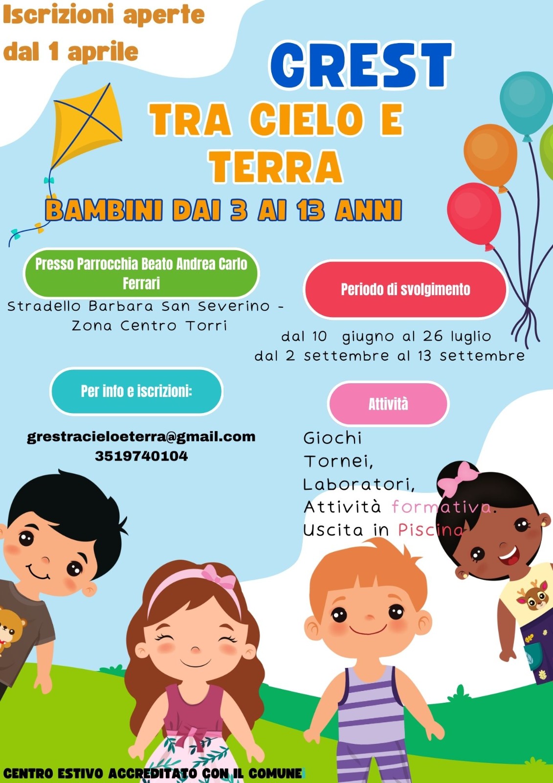 Un’estate piena di avventure e divertimento vi aspetta al Centro Estivo “Tra Cielo e Terra”! Unisciti a noi per un’esperienza indimenticabile.